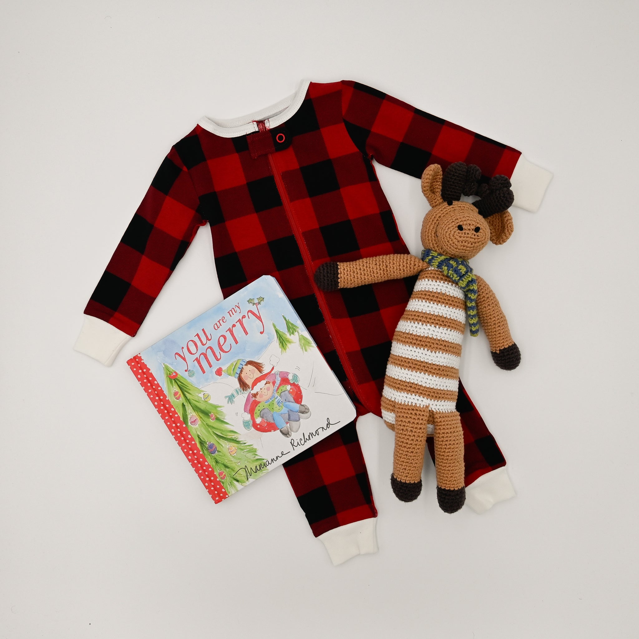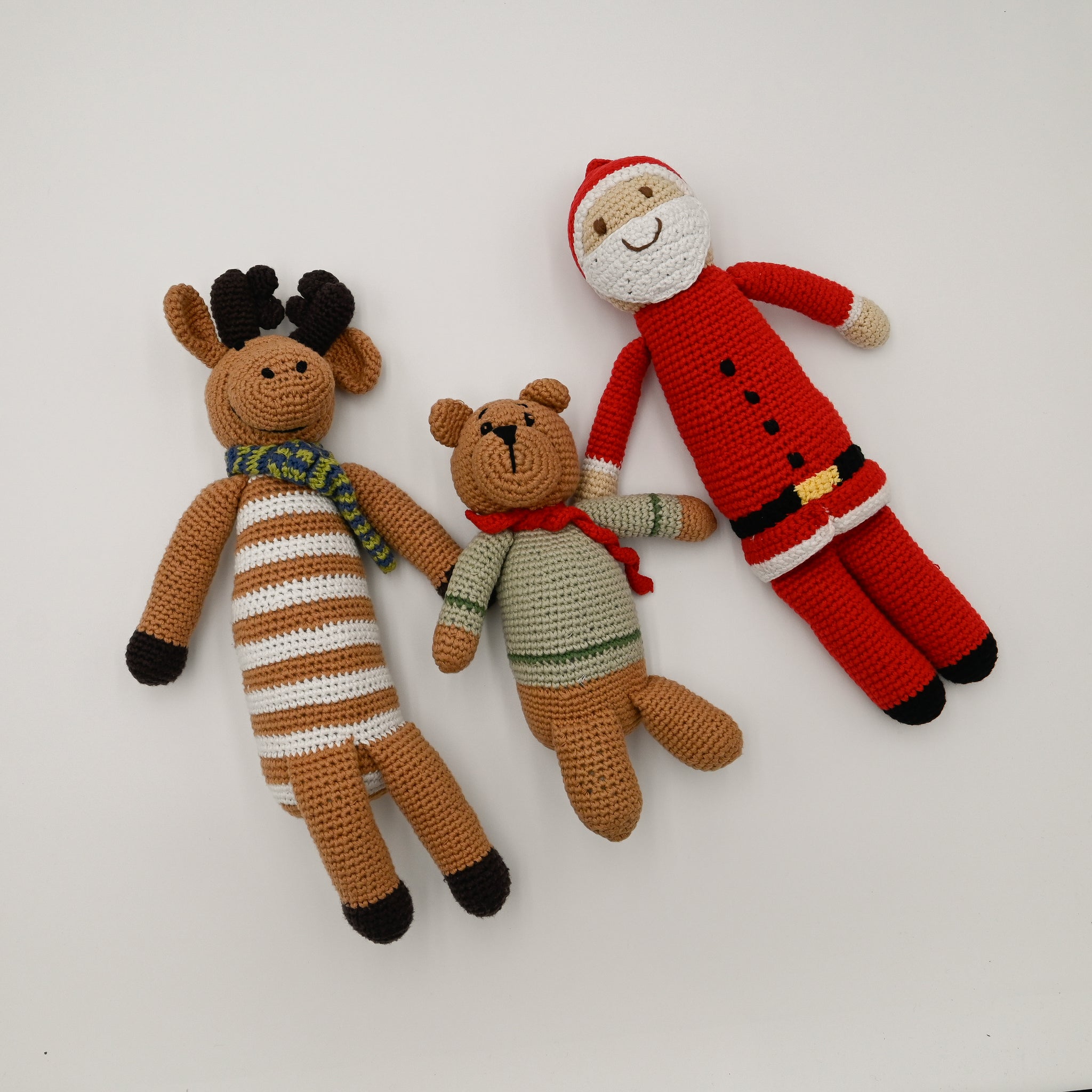 The Christmas Moose is handmade with soft cotton yarn and stitched carefully with love. Designed with baby's safety in mind, these toys are non-toxic and soft, with no removable parts. And, for our young environmentalists, the plus crochet moose is ethically sourced fair trade, eco-friendly + sustainable.