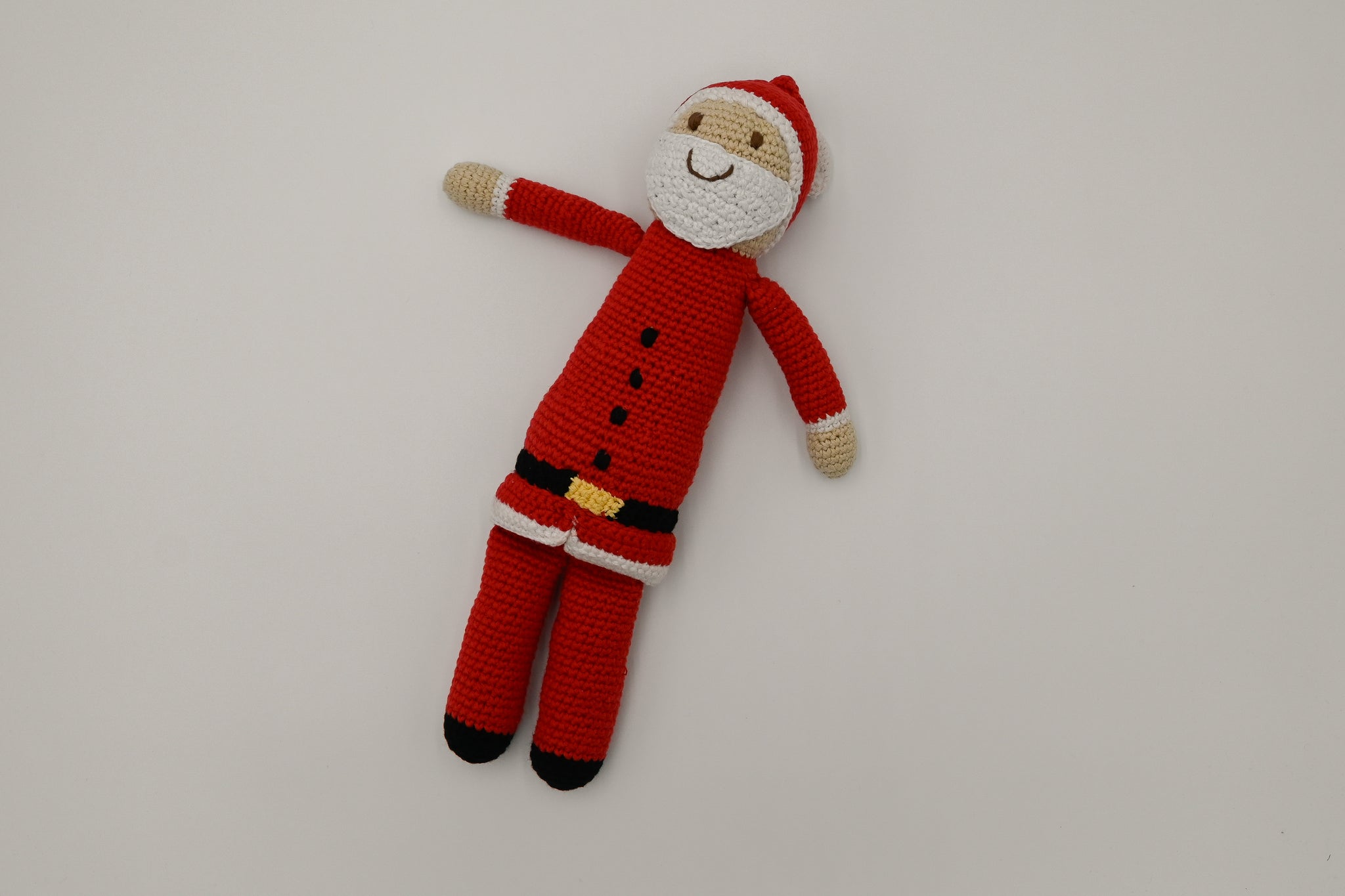 Santa is handmade with soft cotton yarn and stitched carefully with love. Designed with baby's safety in mind, these toys are non-toxic and soft, with no removable parts. And, for our young environmentalists, the plus crochet Santa is ethically sourced fair trade, eco-friendly + sustainable.